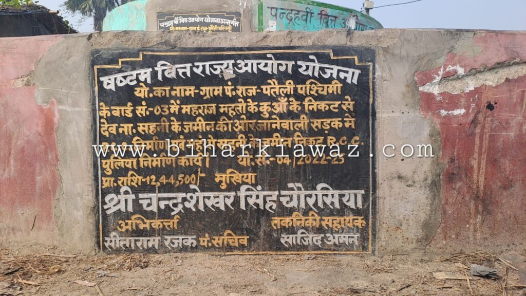 अरविन्द कुमार/समस्तीपुर: उजियारपुर प्रखंड अंतर्गत पतैली पश्चिमी पंचायत के वार्ड संख्या 03 में, षष्ठम वित्त मद द्वारा वित्तीय वर्ष 2022-2023 में, महाराज महतो के कुआं के पास से देवनारायण सहनी के घर की ओर जाने वाली सड़क में, देव नारायण सहनी के घर के निकट बने आरसीसी पुल बनने के 1 वर्ष के अंदर ही भ्रष्टाचार की भेंट चढ़ गया है।