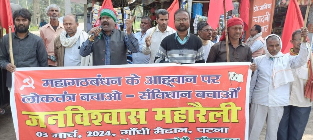 रेलवे, हवाई अड्डा, बैंक, एल आई सी, कल कारखाने को बेचने वाली बेशर्मी से विकास की बात करने लगी है। उन्होंने कहा कि स्थानीय सान्सद नित्यानंद राय ने एक भी लोगों को तो रोजगार नहीं दिया, लेकिन लोन लेने और कर्जदार बन जाने के लिए प्रेरित करता है। सभा को संबोधित करते हुए जिला स्थाई समिति सदस्य फूलबाबू सिंह ने कहा कि इलेक्ट्राॅल बान्ड के माध्यम से भाजपा ने 5271 हजार करोड़ देशी एवं विदेशी पूँजीपतियों से अवैध चुनावी चन्दा लेकर पिछला लोकसभा चुनाव लङा था। जिसका जांच सर्वोच्च न्यायालय द्वारा किया जा रहा है। उन्होंने कहा कि भाजपा सरकार अब तक के सबसे बड़ा महा घोटाला में फस चुकी है। प्रखंड सचिव गंगा प्रसाद पासवान ने अपने सम्बोधन में हजारों लोगों को पटना “जन विश्वास रैली ” में 03 मार्च को शामिल होने का अपील किया। सभा को प्रखंड कमिटी सदस्य मो फरमान, राज कुमार कुलकर्णी, अमरजीत पाल, मन्जय महतो, राम बलि सिंह, राज कुमार चौरसिया, नवीन कुमार सिंह, मोहम्मद सकूर, रोहित कुमार, सहित अन्य लोगों ने सम्बोधित किया।