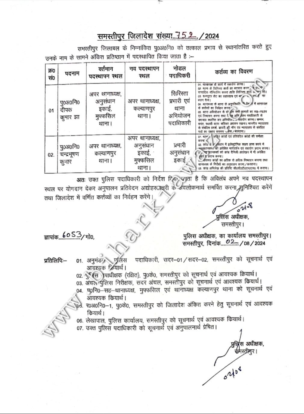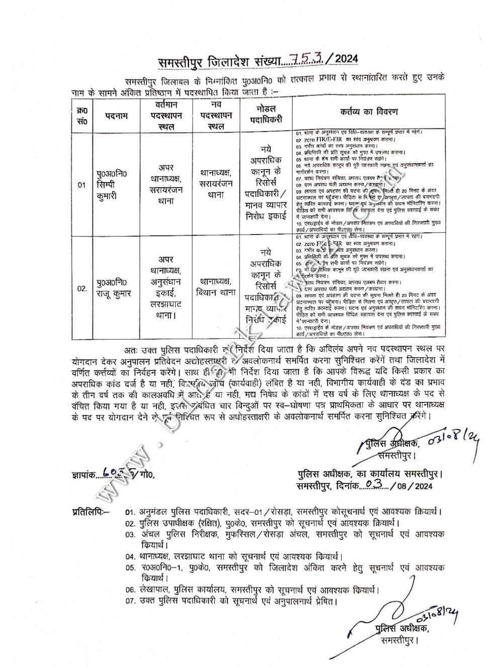 वहीं दुसरी तरफ लड़झाघाट थाना में अपर थानाध्यक्ष के रूप में तैनात राजू कुमार को बिथान थाने का थानाध्यक्ष बनाया गया है।