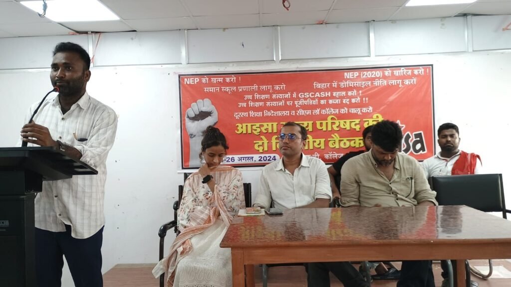 आइसा बिहार राज्य परिषद की दो दिवसीय बैठक रविवार 25 अगस्त से प्रारंभ हो गयी। आयोजित इस बैठक की अध्यक्षता, आईसा की राज्याध्यक्ष प्रीति कुमारी ने किया, तथा संचालन राज्य सचिव सबीर कुमार ने किया।