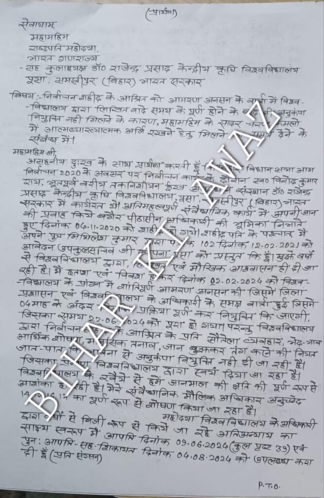 अरविन्द कुमार/अमित कुमार:( समस्तीपुर ) जिले के पुसा प्रखंड अंतर्गत हरपुर पुसा गांव निवासी, चिंता देवी ने डॉ राजेंद्र प्रसाद केंद्रीय कृषि विश्वविद्यालय के ईख अनुसंधान संस्थान में, वरीय तकनीशियन के पद पर कार्यरत अपने पति स्वर्गीय विनोद कुमार राय की मौत के करीब, 4 वर्षों बाद भी उनके स्थान पर अनुकंपा के आधार पर उनके परिवार के किसी भी सदस्य को अभी तक नौकरी नही दी गयी है।