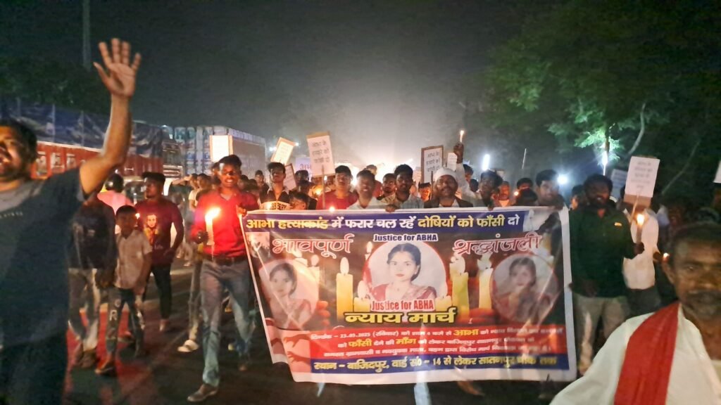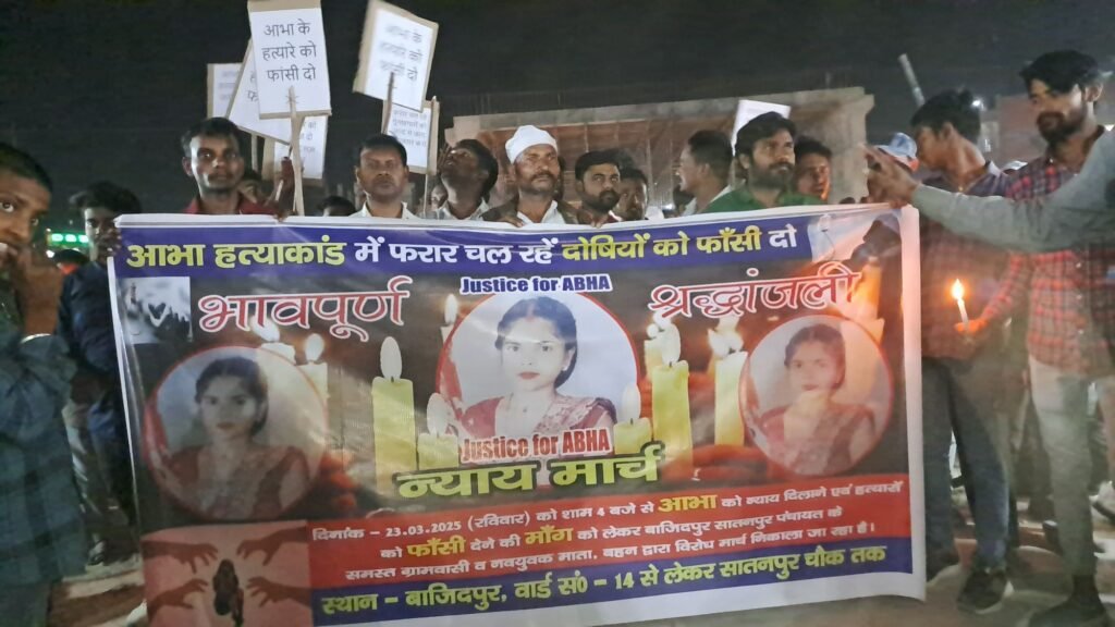 समस्तीपुर। जिले के उजियारपुर थाना अंतर्गत सातनपुर बाजिदपुर गांव में, पिछले दिनों आभा कुमारी की हुई निर्मम हत्या के विरोध में, स्थानीय लोगों ने भाकपा-माले नेता गंगा प्रसाद पासवान, व सैयदुल जफर अंसारी के नेतृत्व में, देर शाम को कैंडिल मार्च निकाला। देर शाम को निकाले गए इस कैंडल मार्च में, सैकड़ों की संख्या में स्थानीय गांव की महिलाएं भी शामिल रहीं।