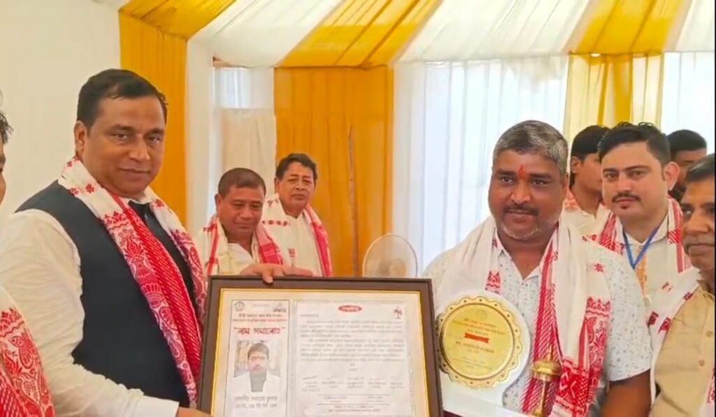 समस्तीपुर। जिले के उजियारपुर प्रखंड मुख्यालय से सटे भगवानपुर कमला गांव निवासी, जिले के चर्चित युवा समाजसेवी भाई राजू सहनी को, असम के गुवाहाटी में संचालित आर्य विद्यापीठ कॉलेज परिसर में श्री श्री सार्वजनिक सत्र की सहयोग व शंकर माधव देव सांस्कृतिक समाज असम सरकार के द्वारा आयोजित कार्यक्रम में, मुख्य अतिथि के रूप में असम सरकार के स्वास्थ्य मंत्री जयंतमल बरूआ, असम सरकार की मेयर मिरगेन सरनियां, जीएमडी चेयरमैन मुक्ता डेका के द्वारा संयुक्त रूप से सम्मानित किया गया।