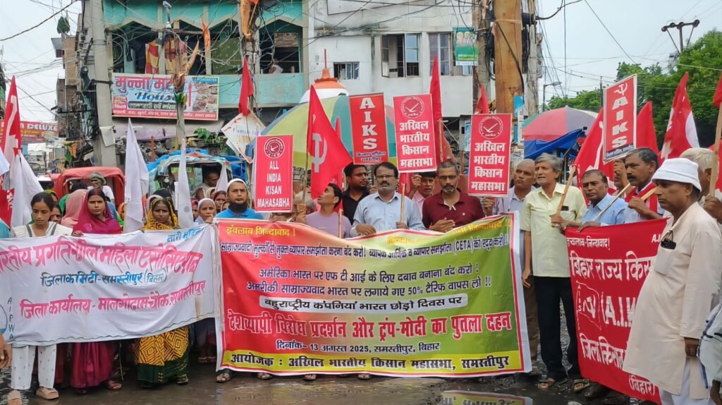 समस्तीपुर। जिला मुख्यालय के स्टेशन चौक पर अखिल भारतीय किसान महासभा, अखिल भारतीय प्रगतिशील महिला एसोसिएशन व संयुक्त किसान मोर्चा के राष्ट्रव्यापी आह्वान पर, बुधवार 13 अगस्त को किसान महासभा के जिलाध्यक्ष महावीर पोद्दार के नेतृत्व में, अमेरिकी राष्ट्रपति डोनाल्ड ट्रम्प व भारत के प्रधानमंत्री नरेंद्र मोदी का पुतला दहन किया गया, तत्पश्चात एक प्रतिरोध सभा का आयोजन भी किया गया।