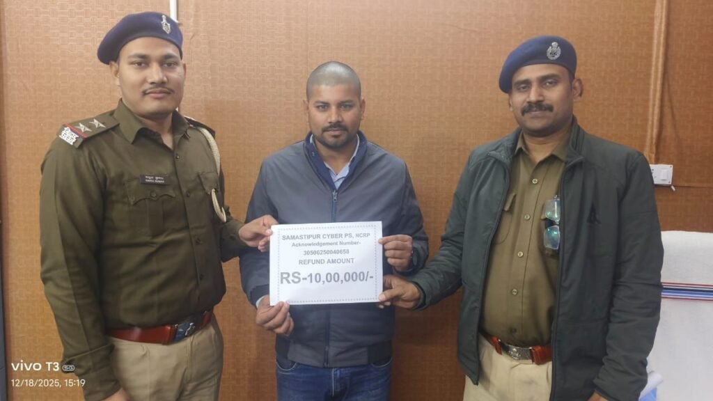 समस्तीपुर! जिला मुख्यालय स्थित साईबर थाना के थानाध्यक्ष सह एसडीपीओ दुर्गेश दीपक ने, साईबर फ्रॉड के जबड़े से एक बहूत बड़ी राशि निकलकर उसके असली स्वामी के हवाले कर दिया। अपनी गंवायी हुई राशि को पाकर पिड़ित महिला व युवक का चेहरा खिल उठा।
