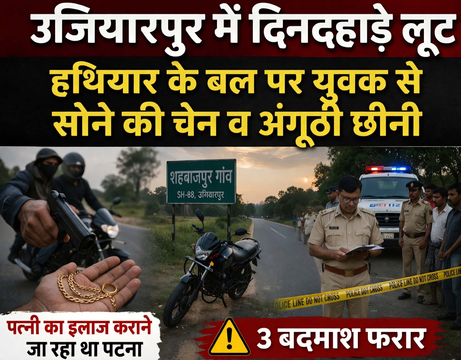 जिसके बाद पिड़ित युवक अपनी पत्नी को एंबुलेंस से पटना के लिए भेजकर, खुद बाईक से ही पटना जाने के लिए निकल गया। इसी दौरान ही उजियारपुर थाना क्षेत्र के शहबाज़पुर एसएच- 88 पर, एक ही बाइक पर सवार तीन की संख्या में अज्ञात बदमाशों ने, उक्त युवक को रोक लिया, तथा पिस्टल का भय दिखाकर उससे सोने की चेन व अंगूठी की लूट कर ली।